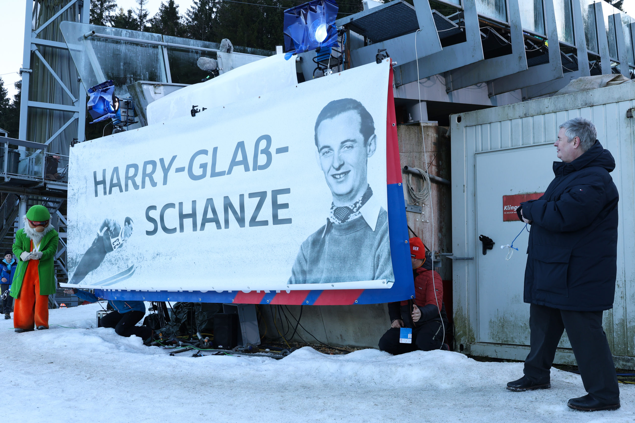 Neben den sportlichen Highlights wurde es in Klingenthal an diesem Tag auch historisch. 70 Jahre nach der Olympia-Saison, in der er die erste deutsche Olympia-Medaille im Skisprung gewann und auf den Tag genau 28-Jahre nach seinem Tod, bekam die Schanze am Schwarzberg seinen Namen. Die Rede ist von der Klingenthaler Skisprung-Legende Harry Glaß. Gemeinsam mit dem Landrat des Vogtlandkreises, Thomas Hennig, und alten Weggefährten wie Manfred Deckert und Matthias Buse, wurden die Zuschauer in der Sparkasse Vogtland Arena Zeugen dieses historischen Momentes Klingenthaler Geschichte. Gemeinsam mit dem Arena Maskottchen Harry, welches ebenfalls den Namen des Weltklasse-Skispringers trägt, enthüllte der Sohn von Harry Glaß, Andreas Glaß, das Schanzen-Banner mit dem neuen Namen. Ab diesem Tag gibt es in Klingenthal die Harry-Glaß-Schanze in der Sparkasse Vogtland Arena.
